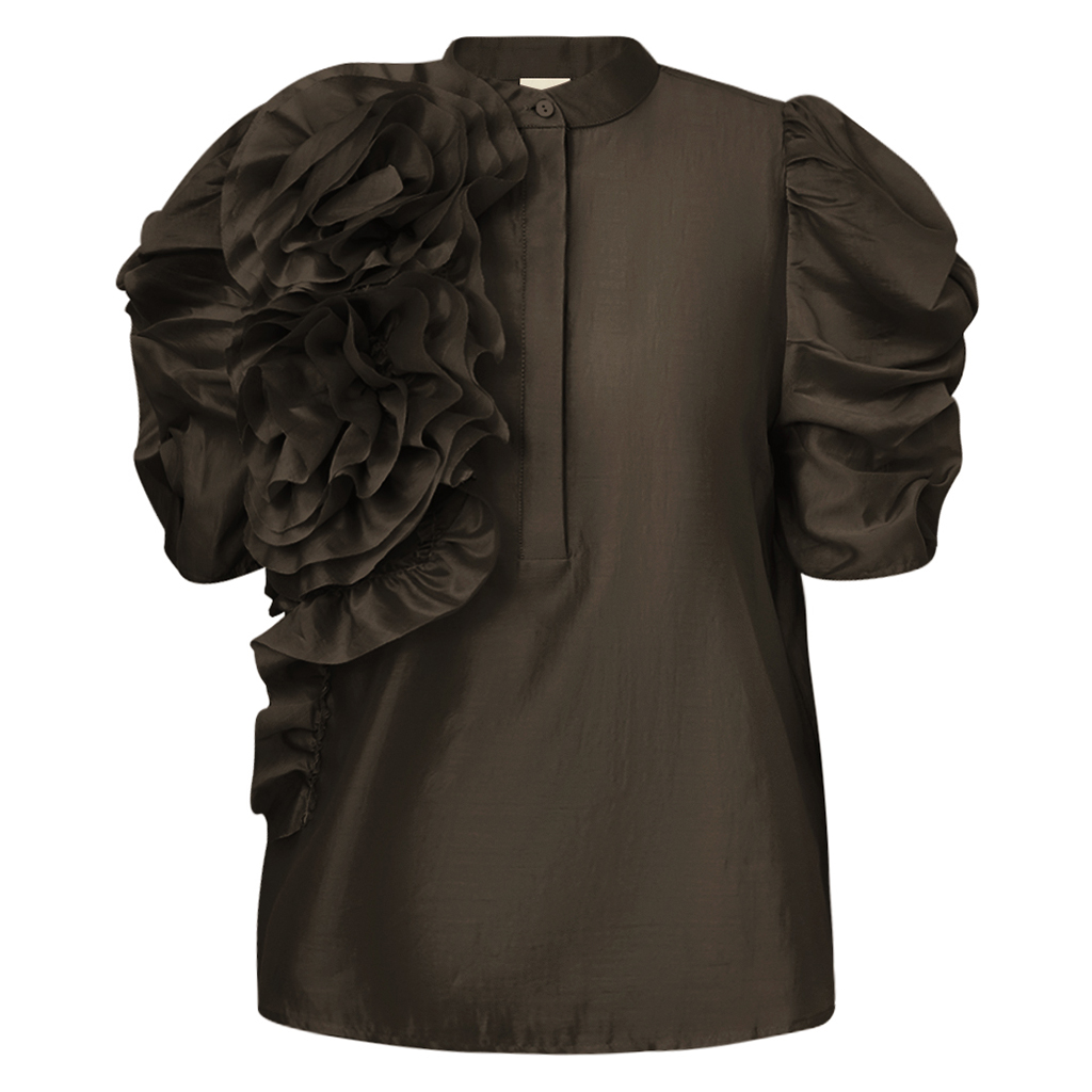 Smukkeste brune bluse fra Gossia. Har pufærmer og blomst i højre side. Materiale: 85% lycocell og 15% polyester. Vask: 30 grader.
