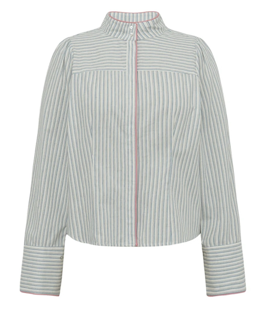 Smuk skræddersyet stribet skjorte fra Gossia. En elegant og klassisk skjorte med smuk kontrastpiping ved hals, skjult knaplukning og manchetter, som giver et raffineret og eksklusivt udseende. Den skræddersyede pasform fremhæver silhuetten på den smukkeste måde. Den ideelle skjorte til kontoret eller til en mere afslappet, men stadig stilfuld aften. Stylingtip: Kombiner den med skræddersyede bukser og loafers for et smart business-look - eller style den med jeans og høje hæle for et afslappet, feminint outfit. Bryst: XS/96 cm, S/100 cm, M/102 cm, L/110 cm, XL/116 cm Længde: XS/60 cm, S/61 cm, M/62 cm, L/63 cm, XL/64 cm Kvalitet: 76% bomuld, 13% viskose, 5% polyester, 3% modal, 3% hør