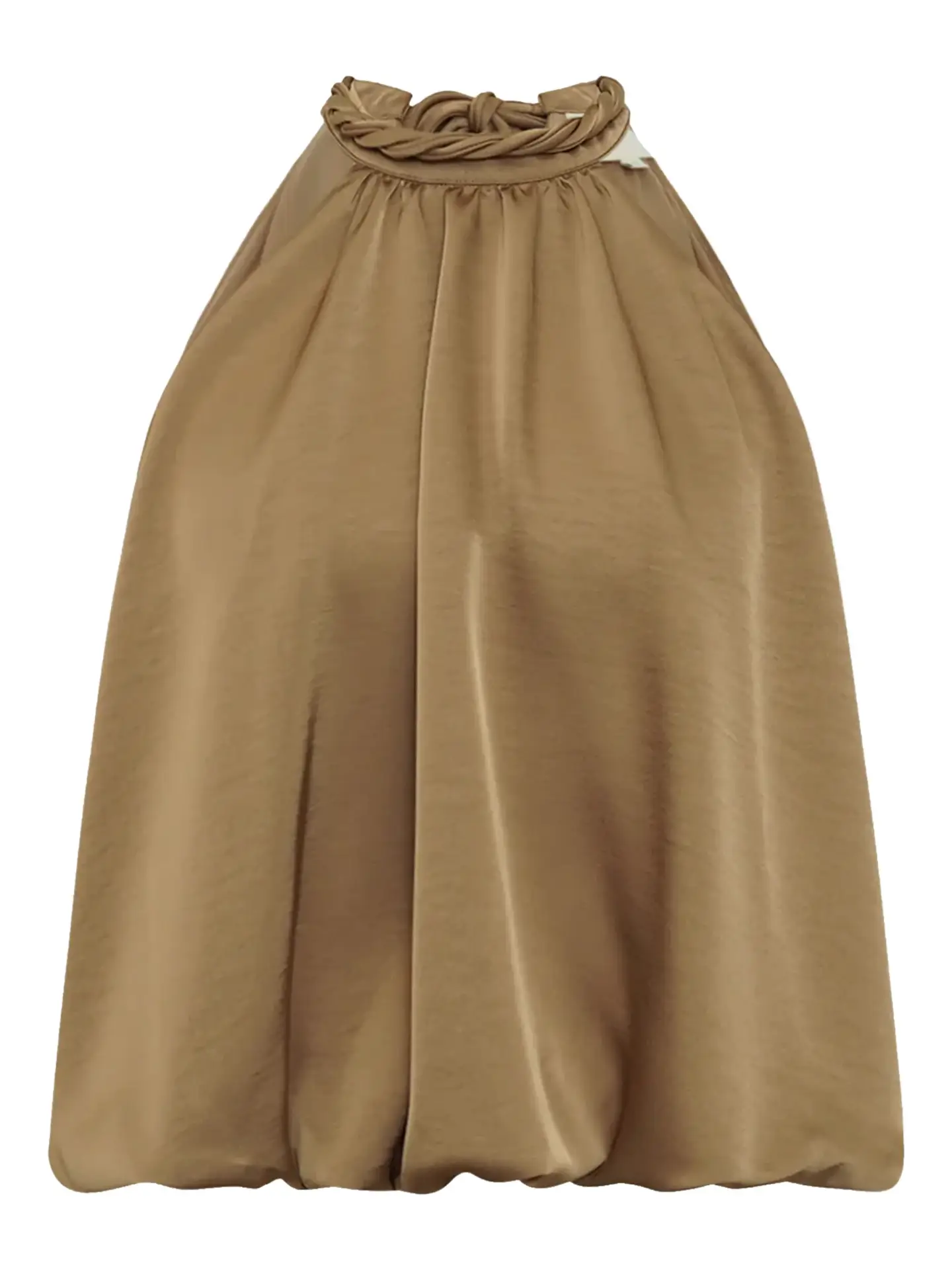 Smuk og festlig top i eksklusiv satin, der giver et elegant og stilrent udtryk. Toppen har en let ballon-effekt, og den indvendige elastik i bunden skaber en smuk og behagelig silhuet med et flot fald. Den bløde mesh-foring sikrer god komfort og et eksklusivt finish. Halsen er dekoreret med elegante snoede snører, der kan bindes i nakken og tilfører et feminint og raffineret udtryk. En smuk, enkel og sofistikeret top, ideel til festlige lejligheder. Bryst: XS/96 cm, S/100 cm, M/104 cm, L/110 cm, XL/116 cm Længde: XS/52 cm, S/53 cm, M/54 cm, L/55 cm, XL/56 cm Farve: Golden Nugga Kvalitet: 100% Polyester Lining: 95% Polyester, 5% Elastane