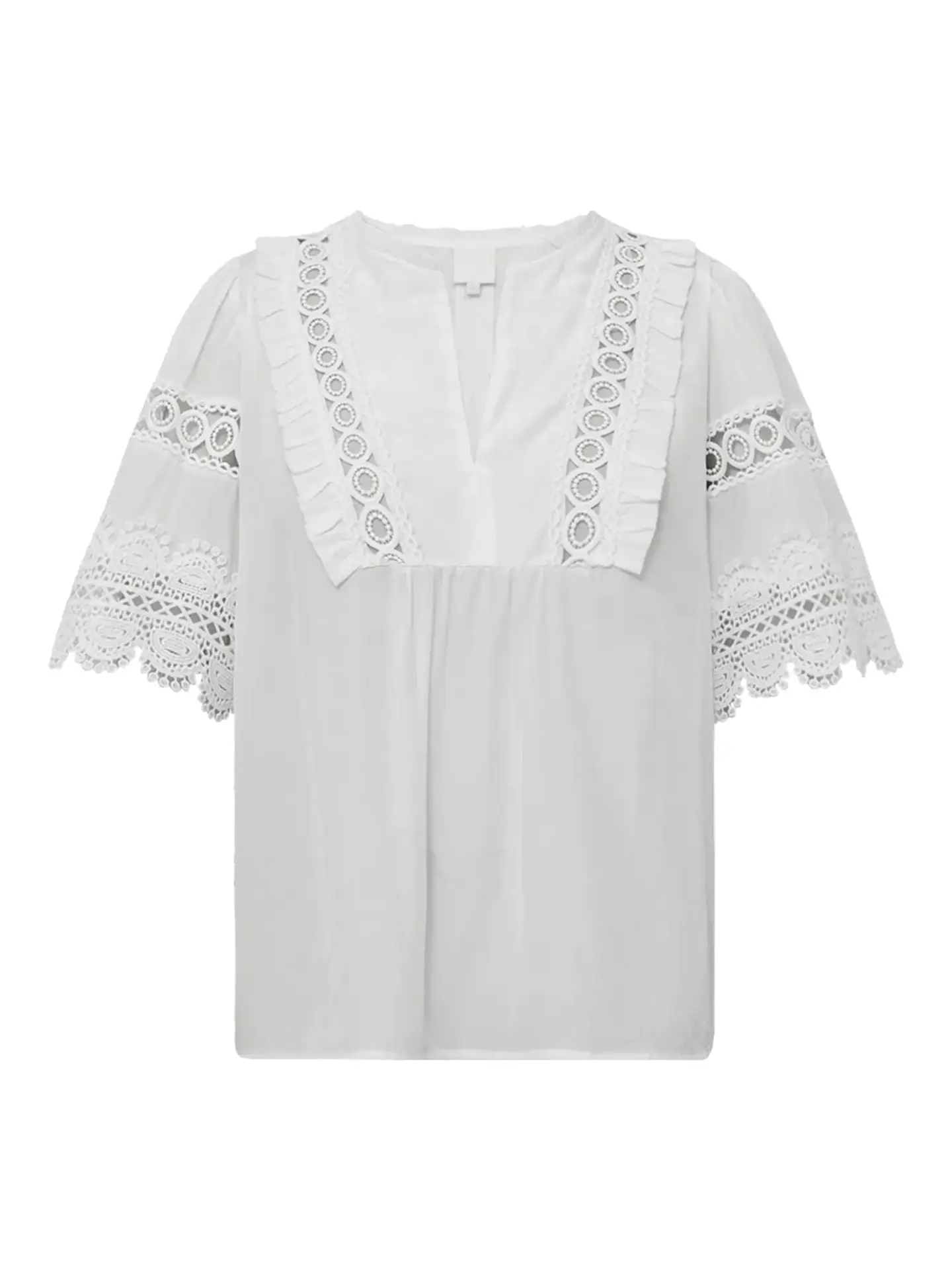 Feminin bluse i en let og behagelig kvalitet, perfekt til både hverdag og fest. En elegant og alsidig bluse med et feminint udtryk. De fine flæser og smukke blondedetaljer tilfører et dekorativt og eksklusivt præg, der løfter ethvert outfit. Bagpå har blusen et læg, som giver en flot pasform og en let bevægelse i stoffet. Detaljerne skaber en smuk silhuet og understreger det feminine design. En stilfuld bluse, der nemt kan styles op eller ned - ideel til både afslappede dage og festlige anledninger. Bryst: XS/98 cm, S/102 cm, M/106 cm, L/112 cm, XL/118 cm Længde: XS/60 cm, S/61 cm, M/62 cm, L/63 cm, XL/64 cm Farve: Off-white Kvalitet: 57% Polyamide 43% Viscose