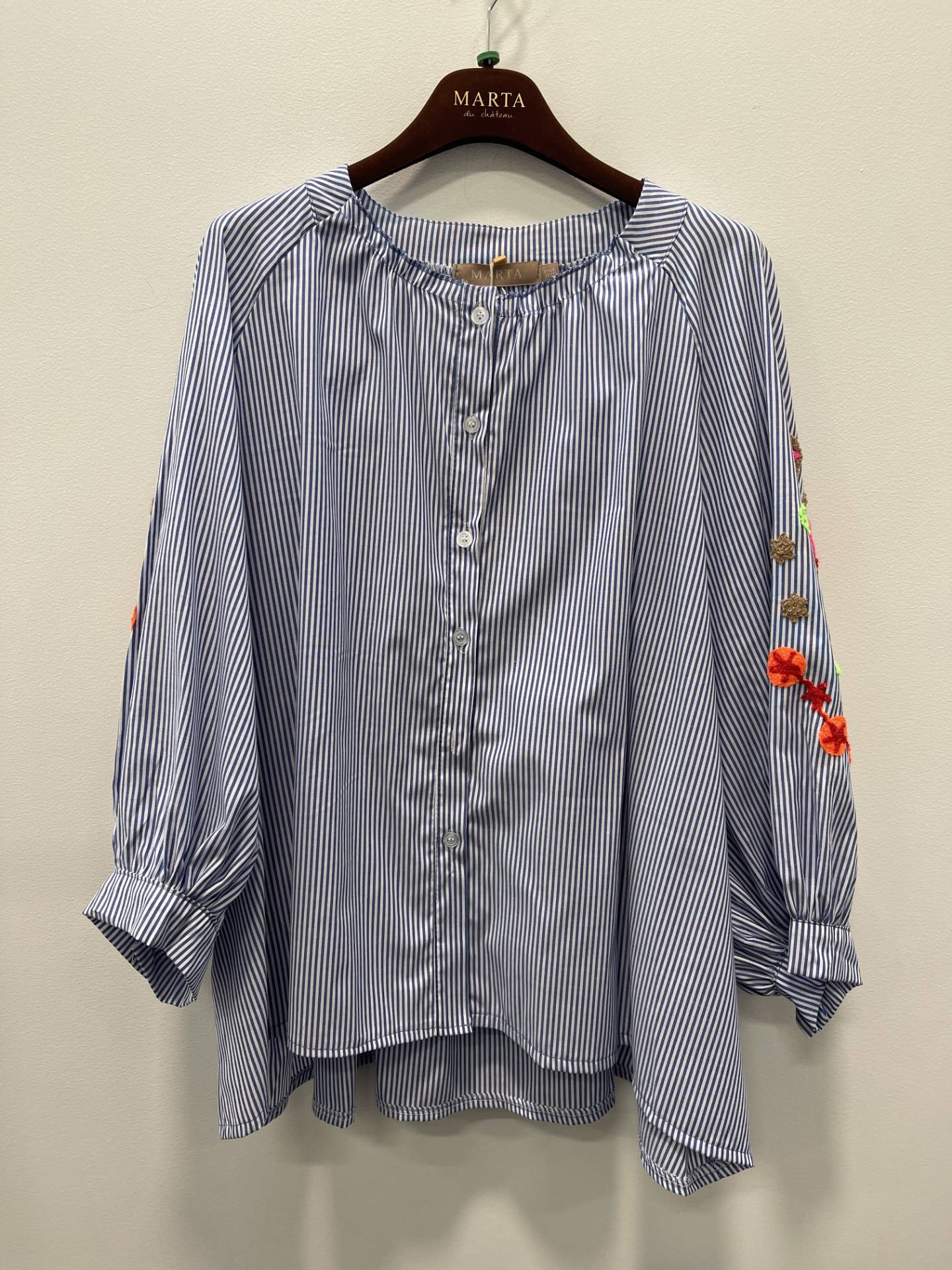 Bluse fra Marta Du Chateau Let og feminin bluse fra Marta Du Chateau i en klassisk blå- og hvidstribet kvalitet med fine, broderede blomsterdetaljer på ærmerne. Blusen har lange raglanærmer med let puf, rund hals med rynkedetaljer og knaplukning foran, som giver et afslappet men elegant udtryk. Materiale: 55% Polyester, 42% Cotton, 3% Elastan