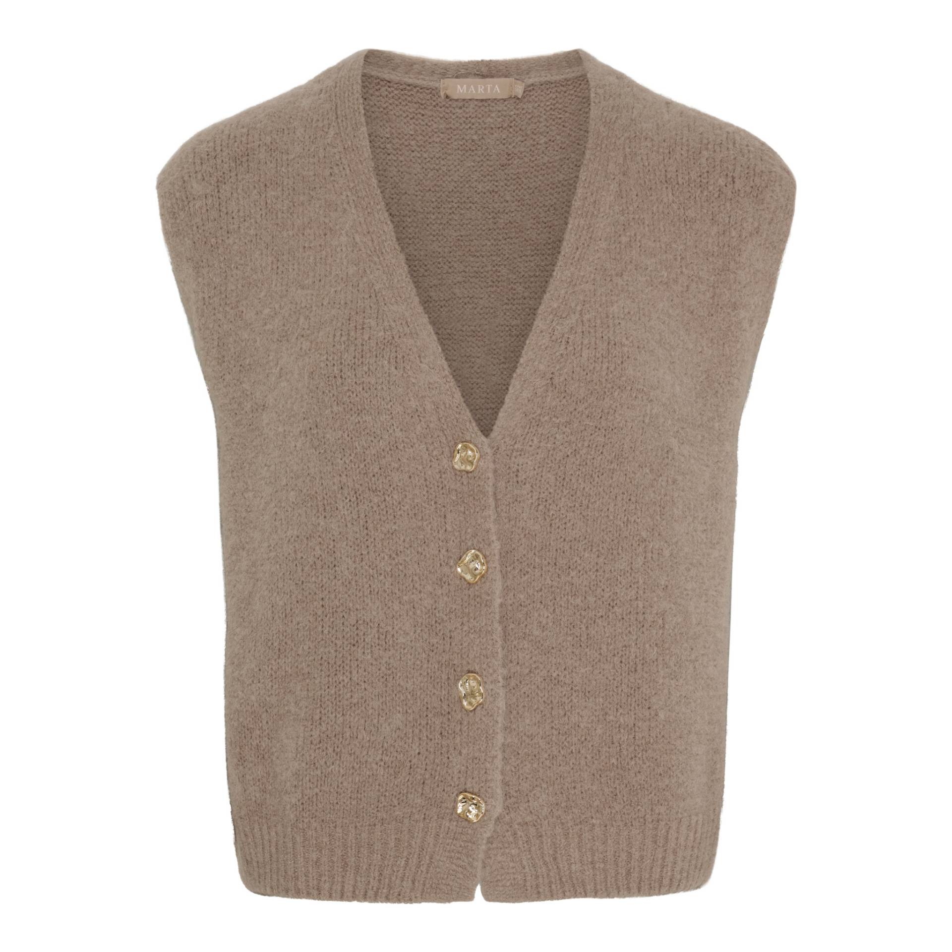 Lækker lysebrun vest fra Marta med guldknapper. Vesten går ned i et V og har ribkant forneden. Materiale: 27% alpaka, 10% uld, 38% polyamid, 22% akryl og 3% elastan. Vask: 30 grader.
