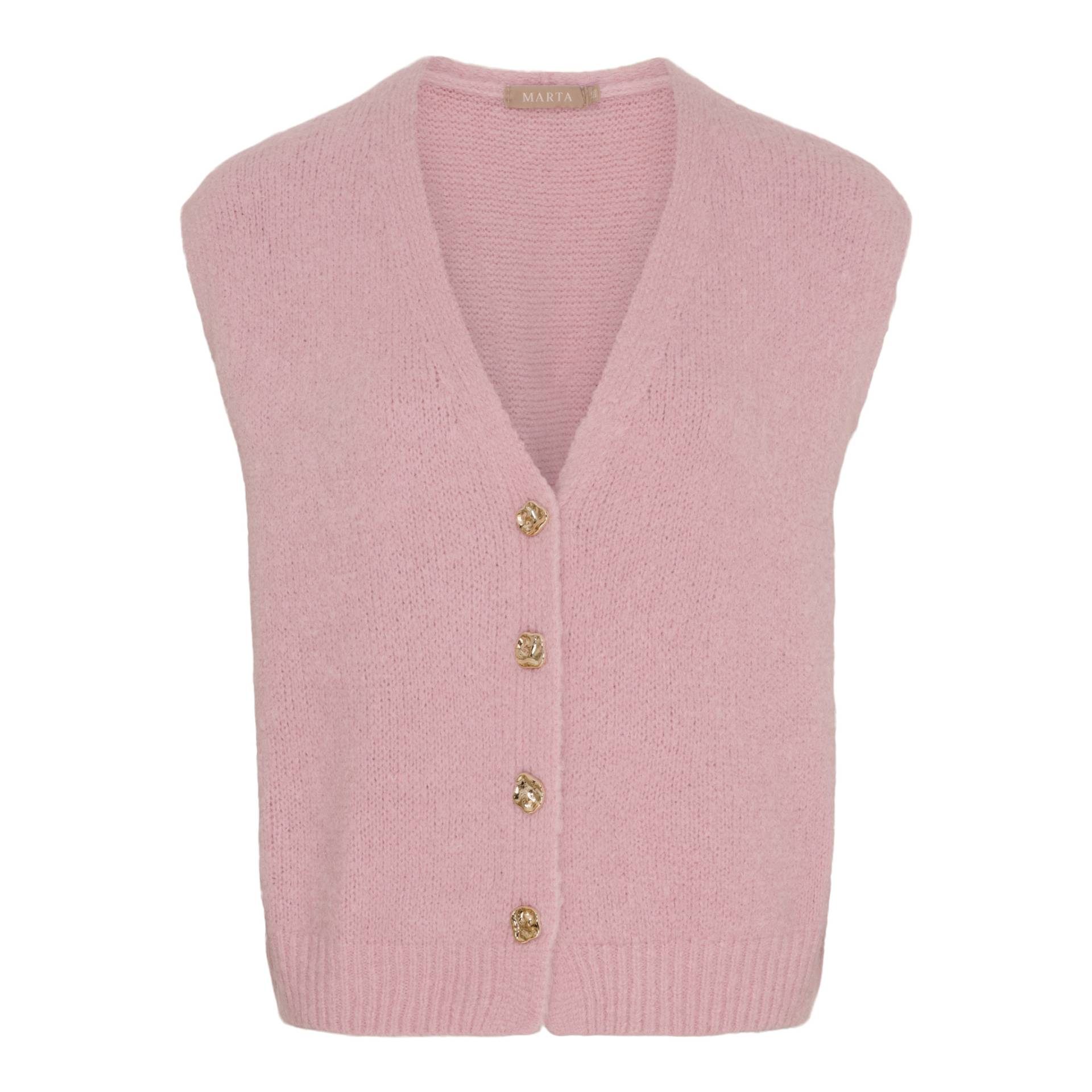 Lækker rosa vest fra Marta med guldknapper. Vesten går ned i et V og har ribkant forneden. Materiale: 27% alpaka, 10% uld, 38% polyamid, 22% akryl og 3% elastan. Vask: 30 grader.