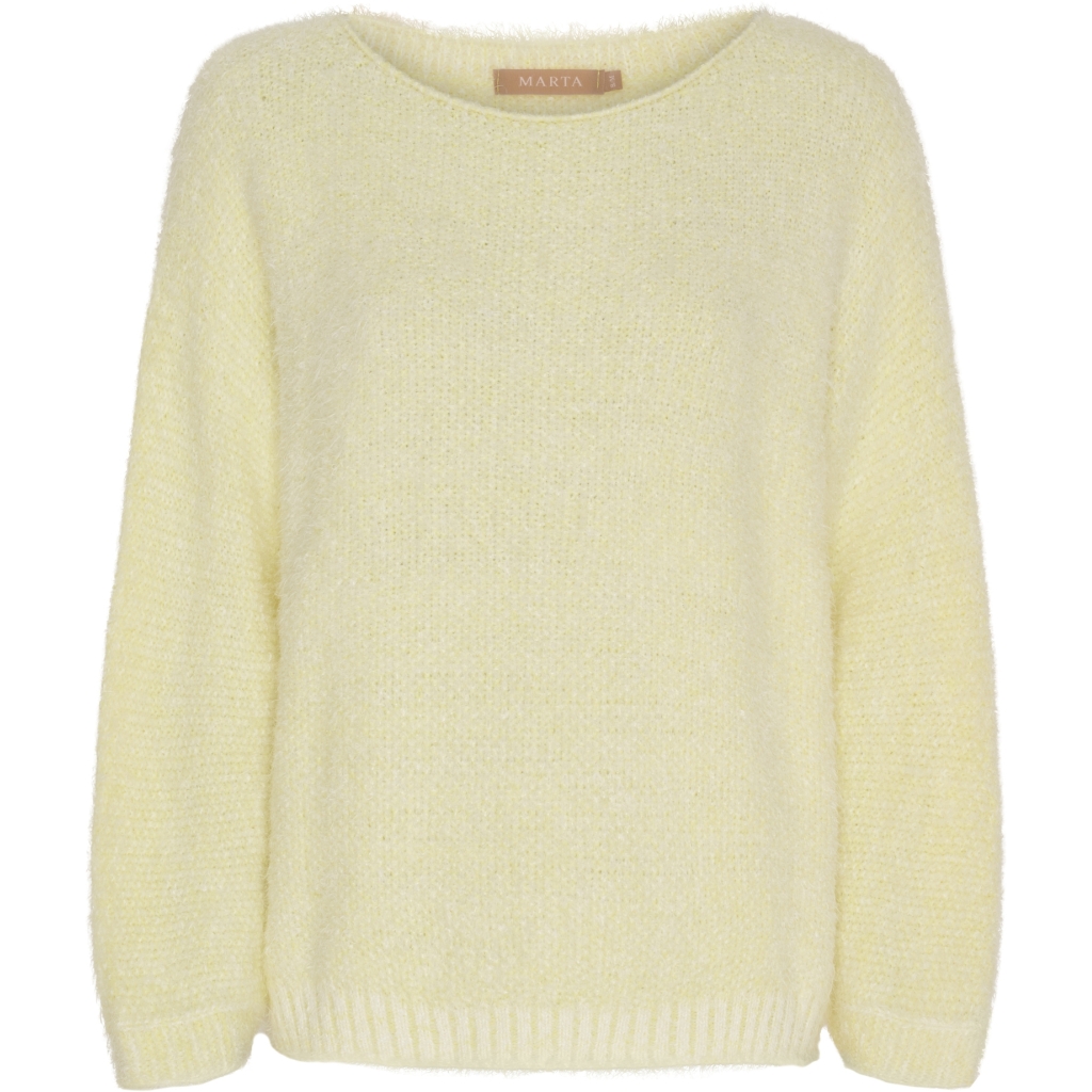 Blødeste strik fra Marta i gul. Blød og fluffy kvalitet for ekstra komfort Rund halsudskæring og lange ærmer for et klassisk design Afslappet pasform, der klæder alle figurer Ideel til både afslappede og mere elegante looks Denne trøje er et must-have til din garderobe - den er tidløs, behagelig og stilfuld! Kvalitet: 50% acryl, 30% polyamid, 10% uld og 10% viscose Størrelse: S/M Længde: 56 cm Brystmål: ca. 114 cm Størrelse: L/XL Længde: 59 cm Brystmål: ca. 120 cm