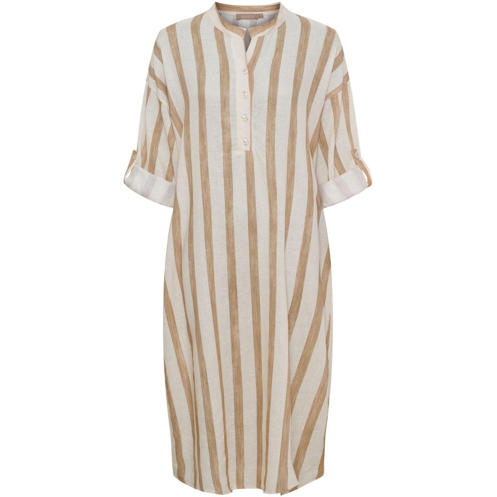 Luftig kjole i et afslappet snit med fine striber, der giver et let og sommerligt udtryk. Designet har stolpelukning og ærmer, der kan smøges op, hvilket tilfører et casual og fleksibelt look. Perfekt til varme dage - style den med sandaler for et afslappet outfit eller med sneakers. Kvalitet: 55% Viscose, 45% Linen S/M Brystmål: 58 cm. Længde: 115 cm. L/XL: Brystmål: 60 cm. Længde:: 117 cm.