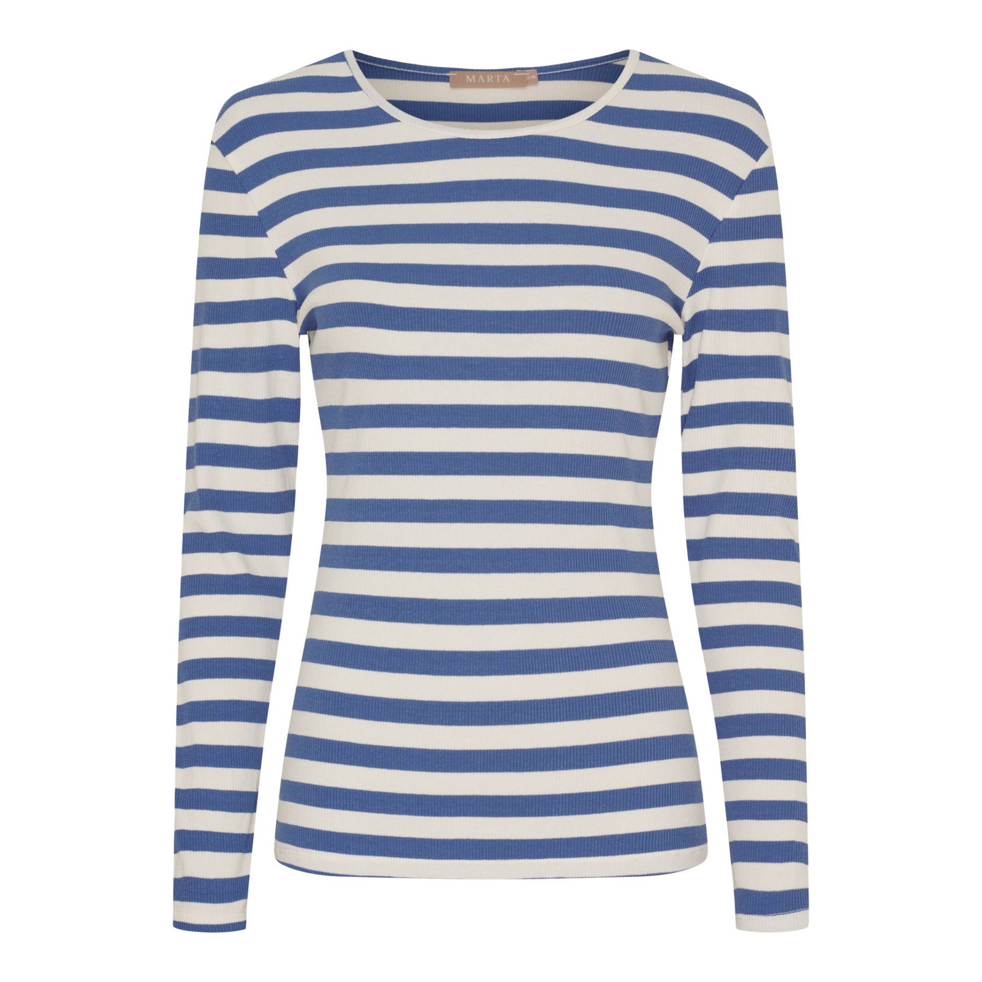 Lækker cremehvid ribtrøje fra Marta med blå striber. Trøjen har rund hals og er meget strækbar. Materiale: 97% viskose og 3% elastan. Vask: 30 grader.