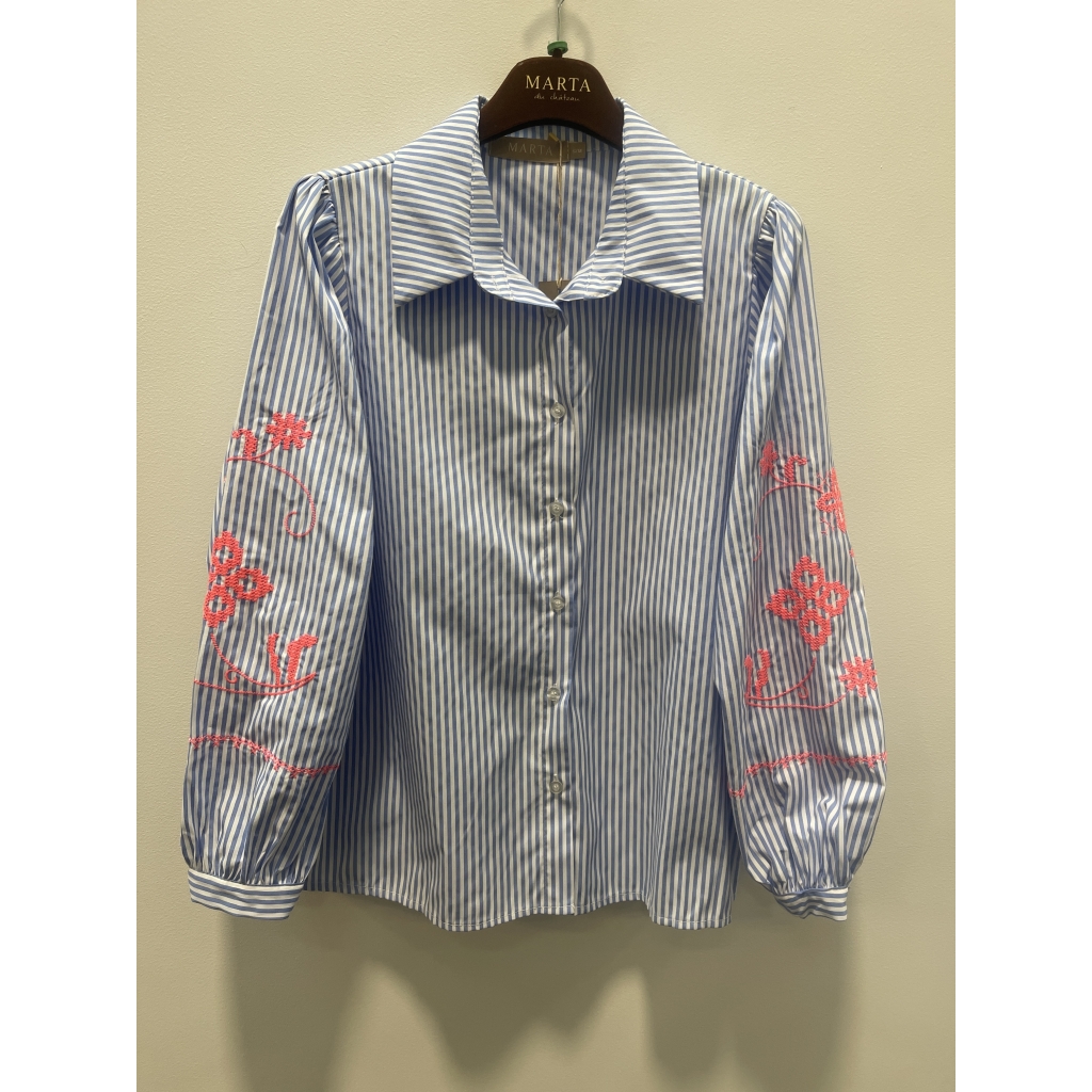 Super flot skjorte fra Marta i hvide og lyseblå striber. Blå og hvidstribet skjortebluse med klassisk krave og knaplukning. Lange, let puffede ærmer med lyserød blomsterbroderi giver et feminint touch. Den er gennemknappet og kan bruges åben eller lukket. Kvalitet: 65% Polyester, 35% Cotton S/M Brystmål: 52 cm. Længde: 62 cm L/XL: Brystmål: 54 cm. Længde: 64 cm.