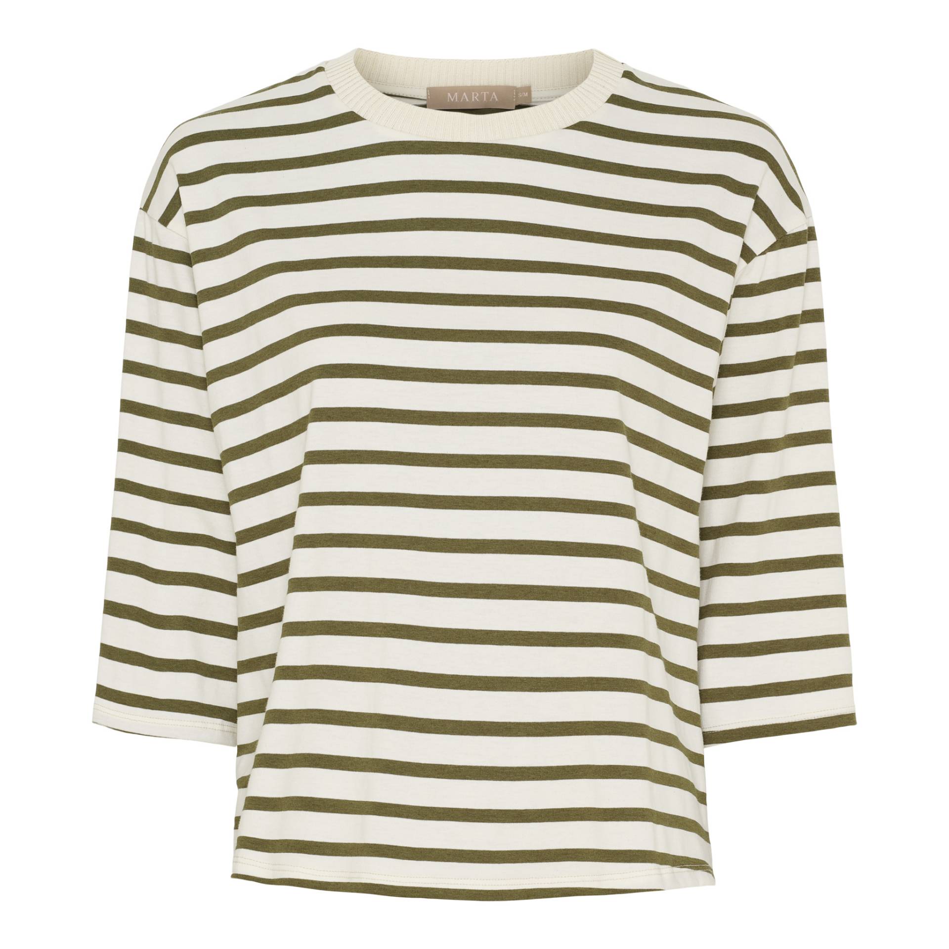 Dejlig t-shirt fra Marta med grønne striber. Har 3/4 ærmer. Materiale: 50% bomuld, 25% viskose, 20% polyester og 5% elastan. Vask: 30 grader.