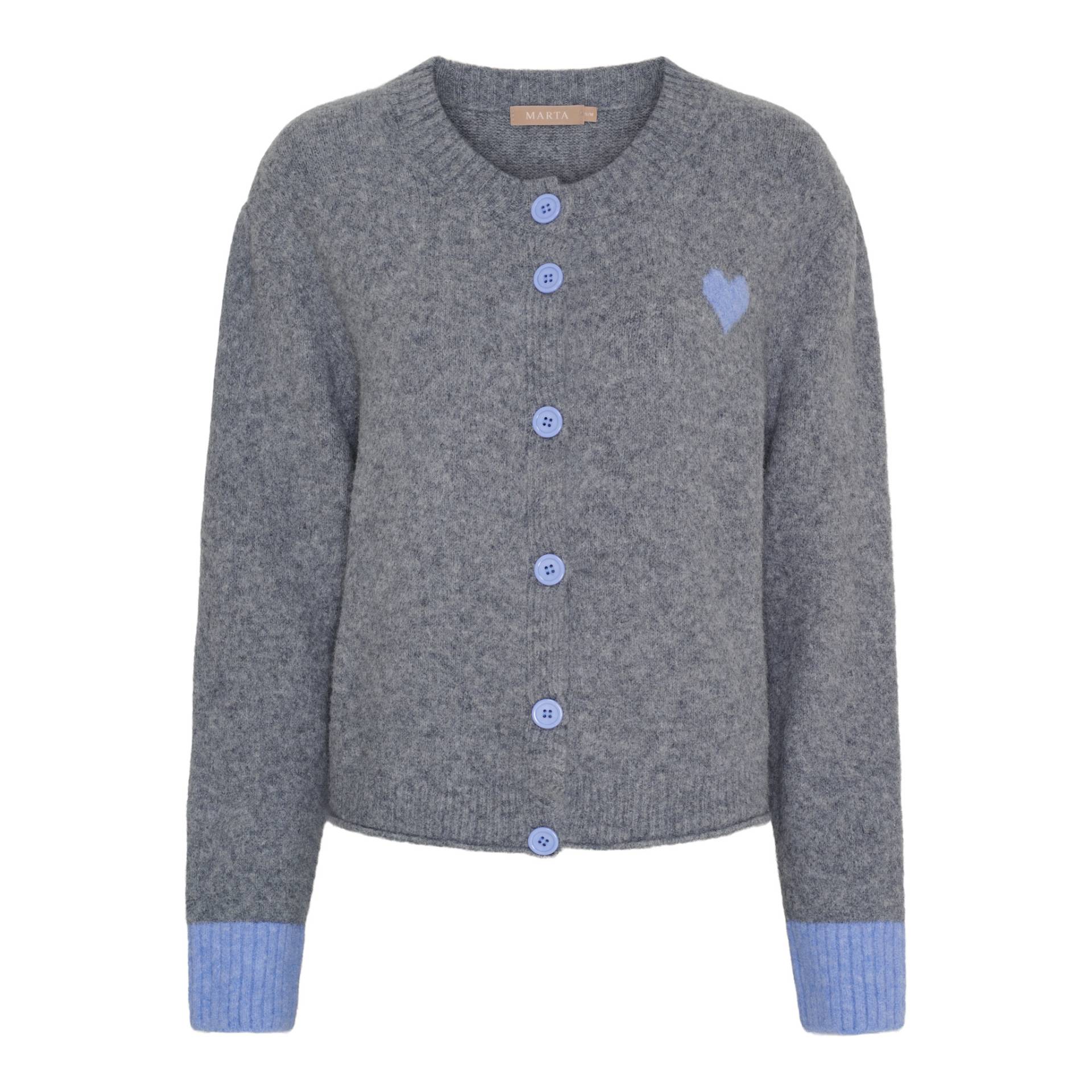 Dejlig grå strikcardigan med blå detaljer fra Marta. Er gennemknappet har har ribkant ved halsen og på ærmerne.