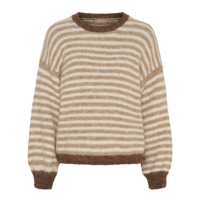 Lækker strik fra Marta med lysebrune og hvide striber. Har ribkant med kontrastfarve ved halsen og nederst ved ærmerne. Materiale: 59% genanvendt polyester, 22% polyamid, 11% polyester, 8% uld og 1% elastan. Vask: 30 grader.