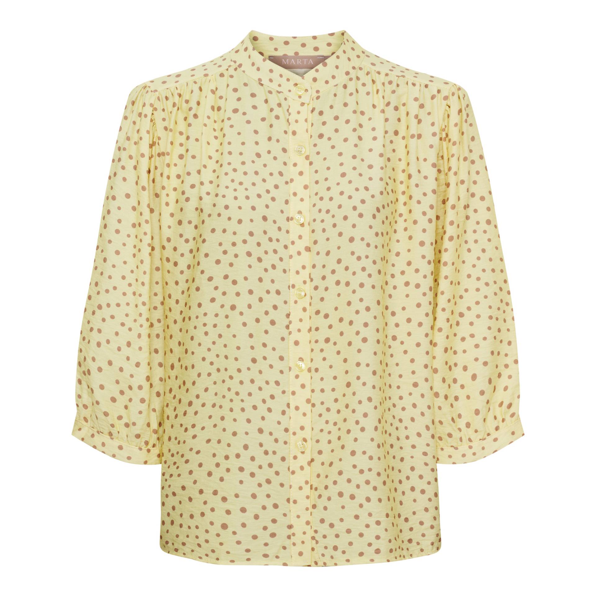 Fineste bluse i gul med brune prikker fra Marta. Den har høj krave og er gennemknappet med 3/4 ærmer. Den har en normal pasform og længde. Kvalitet: 90% Viskose, 10% Nylon S/M: Brystmål: ca. 62 cm. Længde: ca. 66 cm. L/XL: Brystmål: ca. 64 cm. Længde: ca. 68 cm.