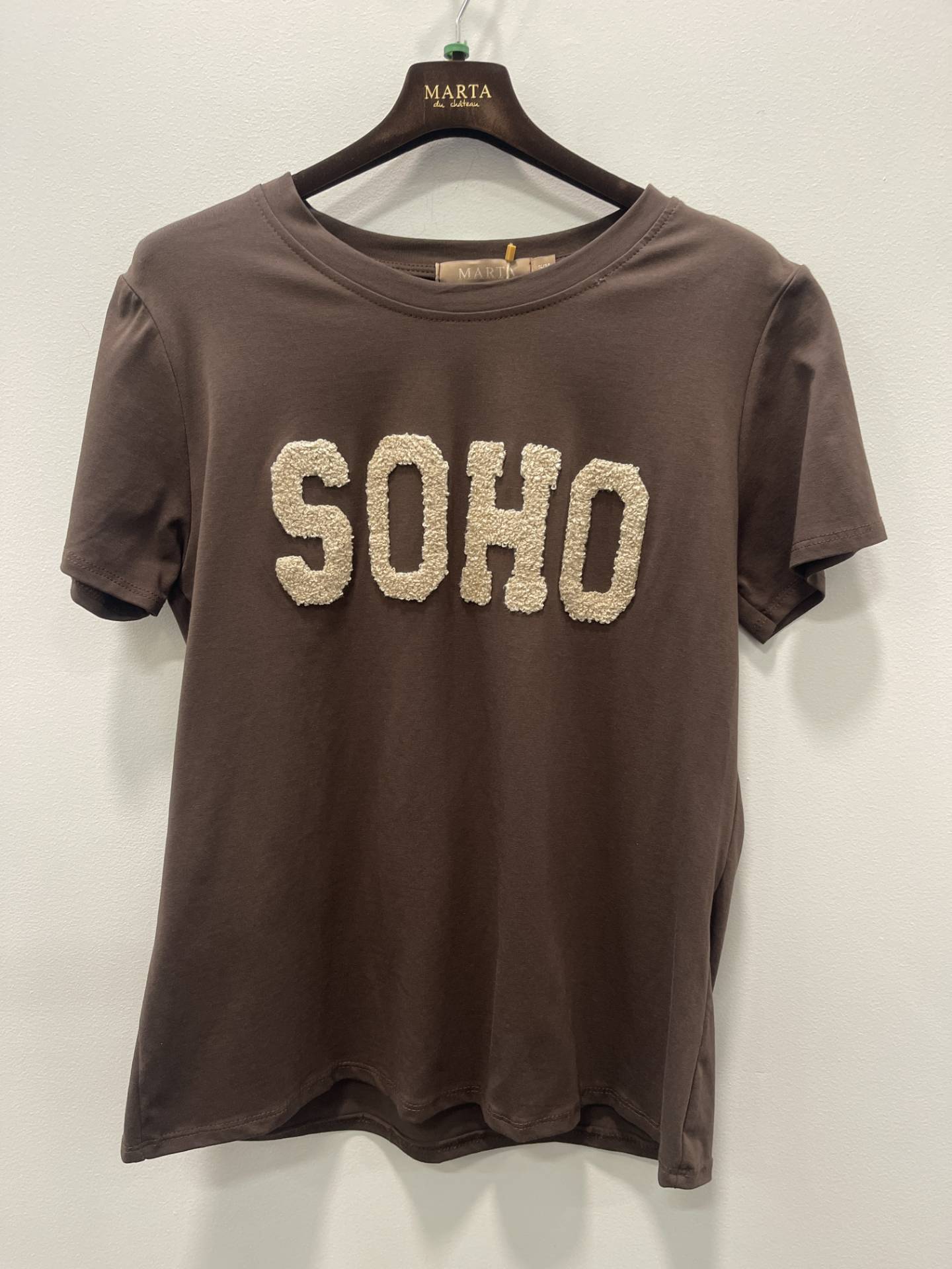 Sød og enkel t- shirt med korte ærmer og bred halsudskæring. "SOHO" står fremhævet på brystet i store, teksturerede bogstaver et enkelt men trendy statement-piece. Normal pasform og længde. Kvalitet: 90% Cotton, 10% Elastan S/M Brystmål: 47 cm. Længde: 64 cm. L/XL: Brystmål: 49 cm. Længde:: 66 cm.
