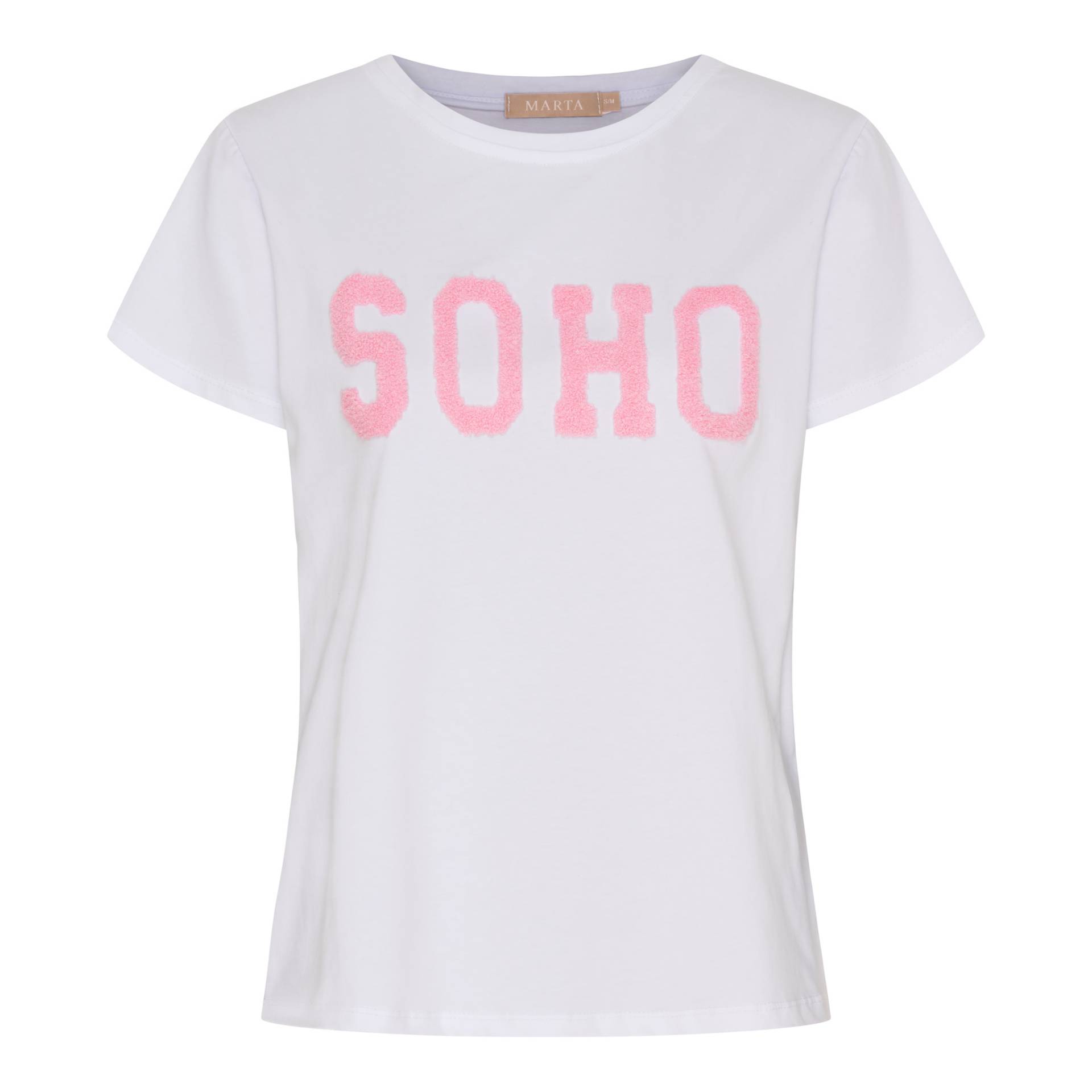 Sød og enkel t- shirt med korte ærmer og bred halsudskæring. "SOHO" står fremhævet på brystet i store, teksturerede bogstaver et enkelt men trendy statement-piece. Normal pasform og længde. Kvalitet: 90% Cotton, 10% Elastan S/M Brystmål: 47 cm. Længde: 64 cm. L/XL: Brystmål: 49 cm. Længde:: 66 cm.