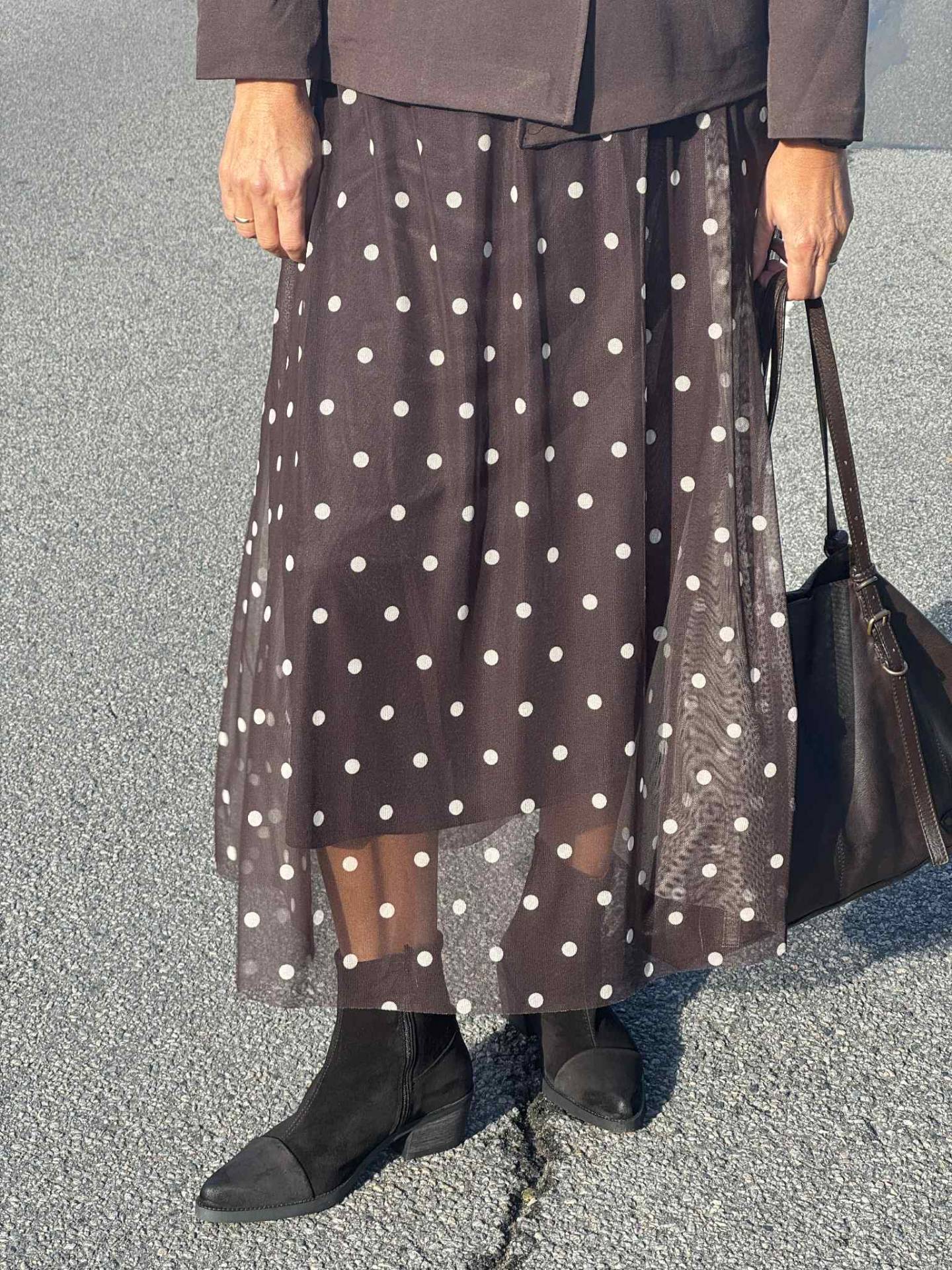 Skøn prikket nederdel med elastik i taljen Styles med strik tee og habitjakke Kval. 94%Polyester 6% Elastan