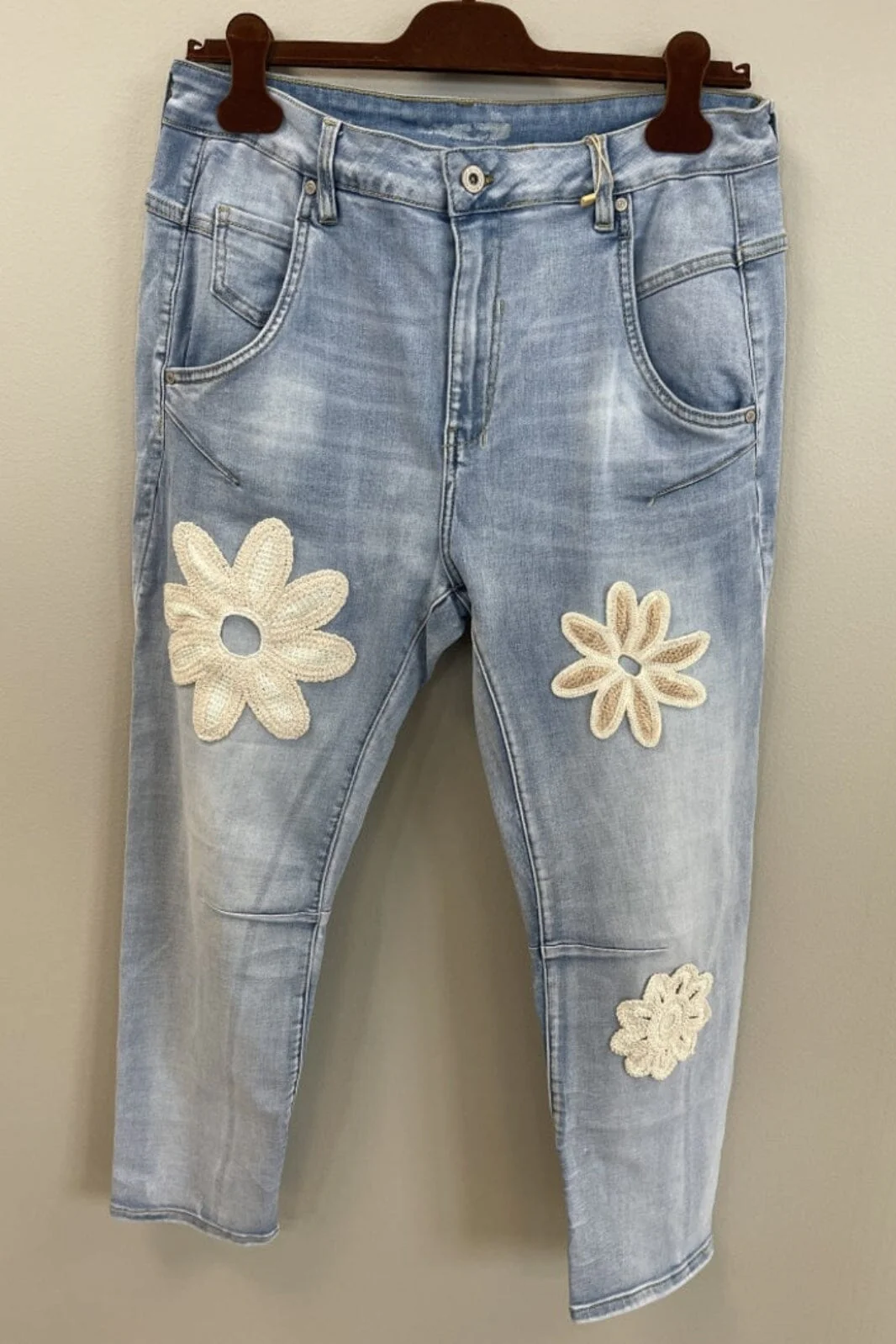 Cool jeans fra Marta i denim med en blomst på benet. Ischa Jeans er et par moderne og alsidige jeans i en klassisk blå farve. Der er elastik i taljen med lynlås og knapper. Der er lommer i siden og bagpå. Kan styles med T-shirts og sneakers til et casual look eller med skjorte og blazer for en mere sofistikeret stil. Kvalitet: 75% bomuld, 20% polyester, 3% viskose og 2% elastan,