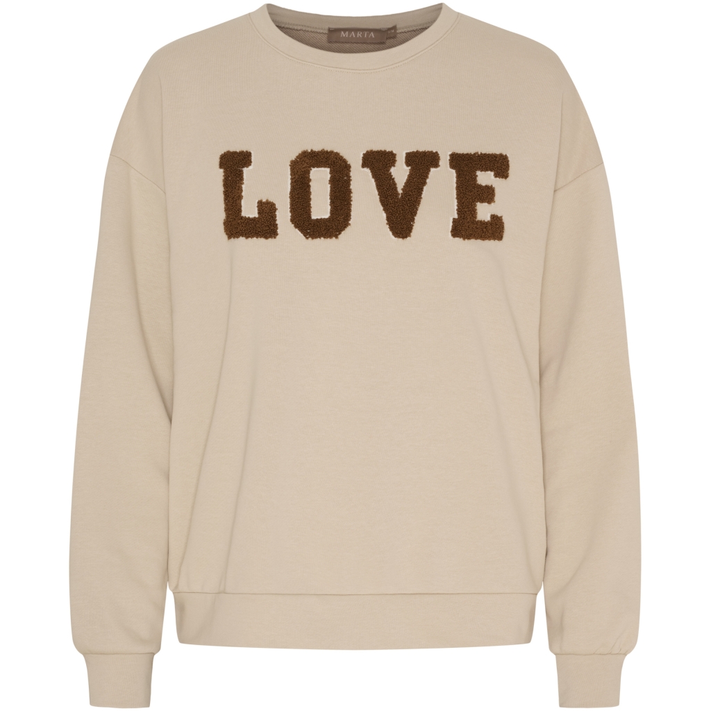Super blød hverdags sweatshirt i en lækker sweat kvalitet fra Marta du cháteau. Sweatshirten er i en flot fango/gul farve, har lange ærmer og "LOVE" printet på brystet. Brug den sammen med et par jeans. Lange ærmer Løs Pasform Størrelsesguide: Den er rummelig i størrelsen. S/M passer str. 34-40. L/XL passer str. 40-44. Materiale: 70% bomuld 30% polyester.