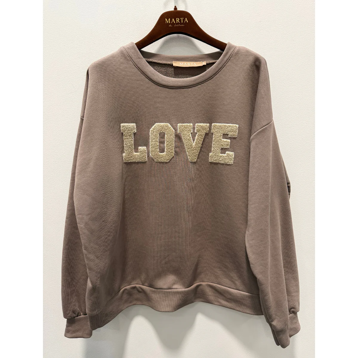 Super blød hverdags sweatshirt i en lækker sweat kvalitet fra Marta du cháteau. Sweatshirten er i en flot fango/beige farve, har lange ærmer og "LOVE" printet på brystet. Brug den sammen med et par jeans. Fango farve ("latte brun") "LOVE" print foran Lange ærmer Løs Pasform Størrelsesguide: Den er rummelig i størrelsen. S/M passer str. 34-40. L/XL passer str. 40-44. Materiale samt vaskeanvisning: 70% bomuld 30% polyester. Vi anbefaler at de vaskes på vrangen på 30 grader skånevask. Krymp max. 3-5%.