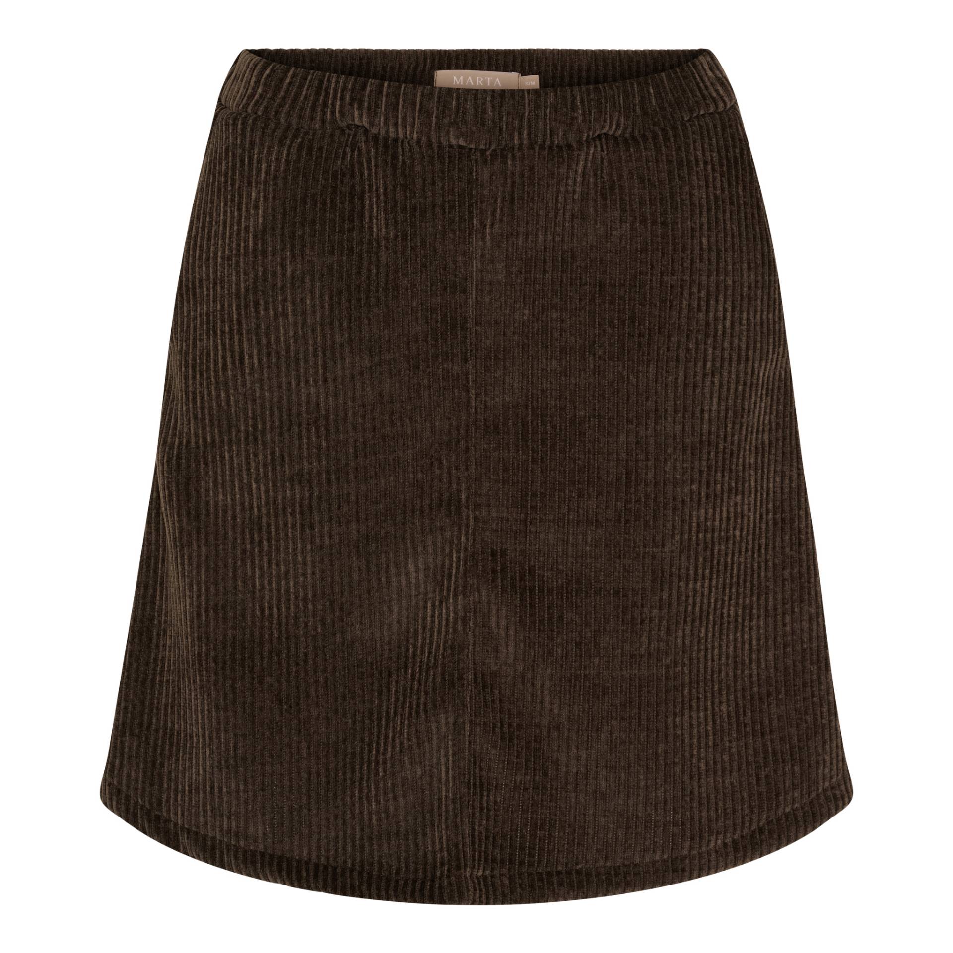 Lækker brun fløjlsnederdel fra Marta. Nederdelen er A-formet og har elastikkant i taljen. Materiale: 98% polyester og 2% elastan. Vask: 30 grader.