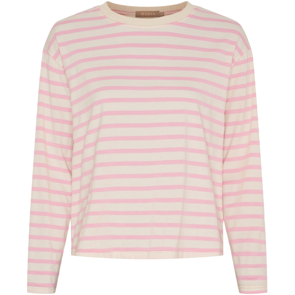 Super fin langærmet fra Marta i hvide og lyserøde striber. Den har rund hals med lange ærmer og normal pasform. Den har en normal længde. Kvalitet: 50% cotton, 25% viscose, 20% polyester, 5% elastan S/M Brystmål: 51 cm. Længde: 61 cm. L/XL: Brystmål: 53 cm. Længde:: 63 cm.