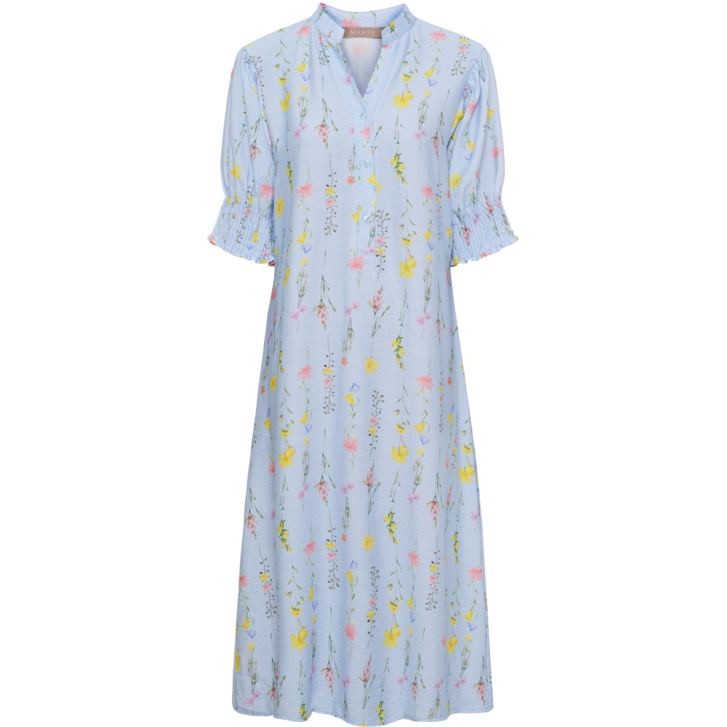 Super smuk kjole fra Marta i blå med farverig blomsterprint. Den har kinakrave med v-udskæring og 3/4 ærmer. Det er en lang model med normal pasform. Styles evt med en hvid sneakers og denimjakke. Kvalitet: 90% Viscose, 10% Nylon S/M Brystmål: 52 cm. Længde: 108 cm. L/XL: Brystmål: 54 cm. Længde:: 110 cm.