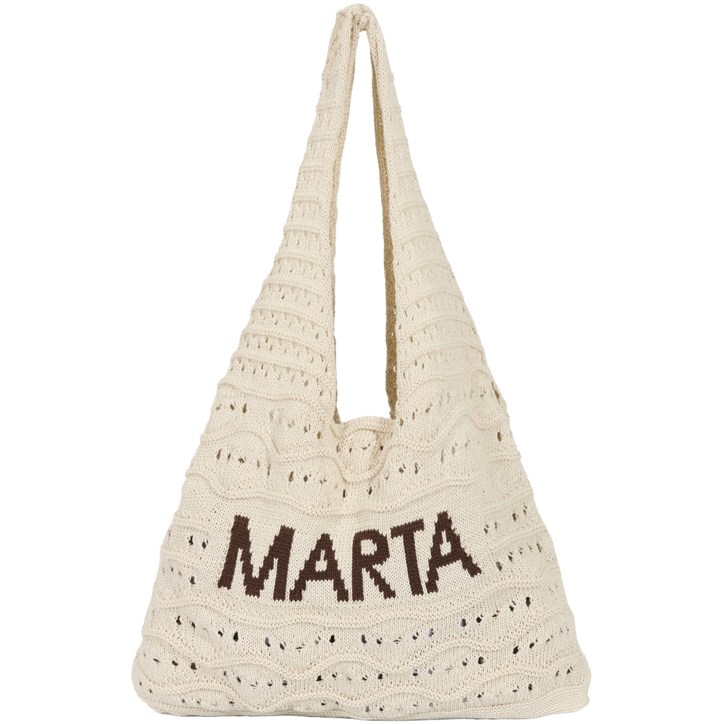 Strikket taske fra Marta med bølgemønster og små huldetaljer. - Kan bruges til strandtaske Materiale: 50% Bomuld, 50% Akryl Højde: 45 cm. Bredde: 64 cm.