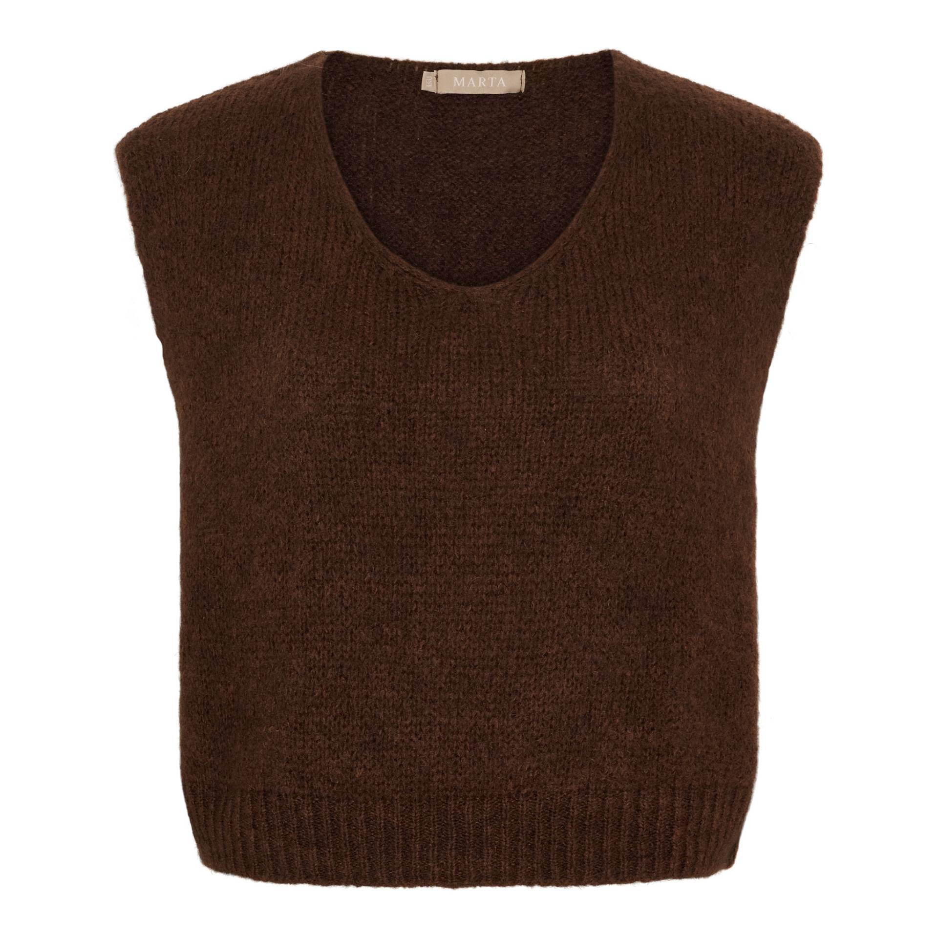 Lækker brun strikket vest fra Marta. Har v-udskæring og ribkant forneden. Materiale: 44% akryl, 26% polyamid, 20% mohair og 10% uld. Vask: håndvask.