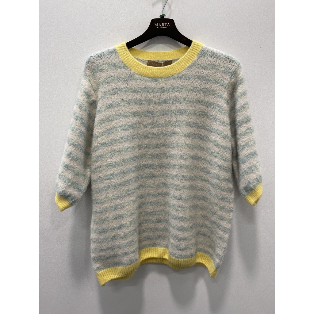 Super fin strik fra Marta i hvid og blå striber med gul kant. Den har rund hals og 3/4 ærmer. Normal længde og pasform. Style den evt med en hvid langærmede indenunder og denim jeans. Kvalitet: 64% polyester, 12% nylon, 12% uld, 10% akryl og 2% elastan