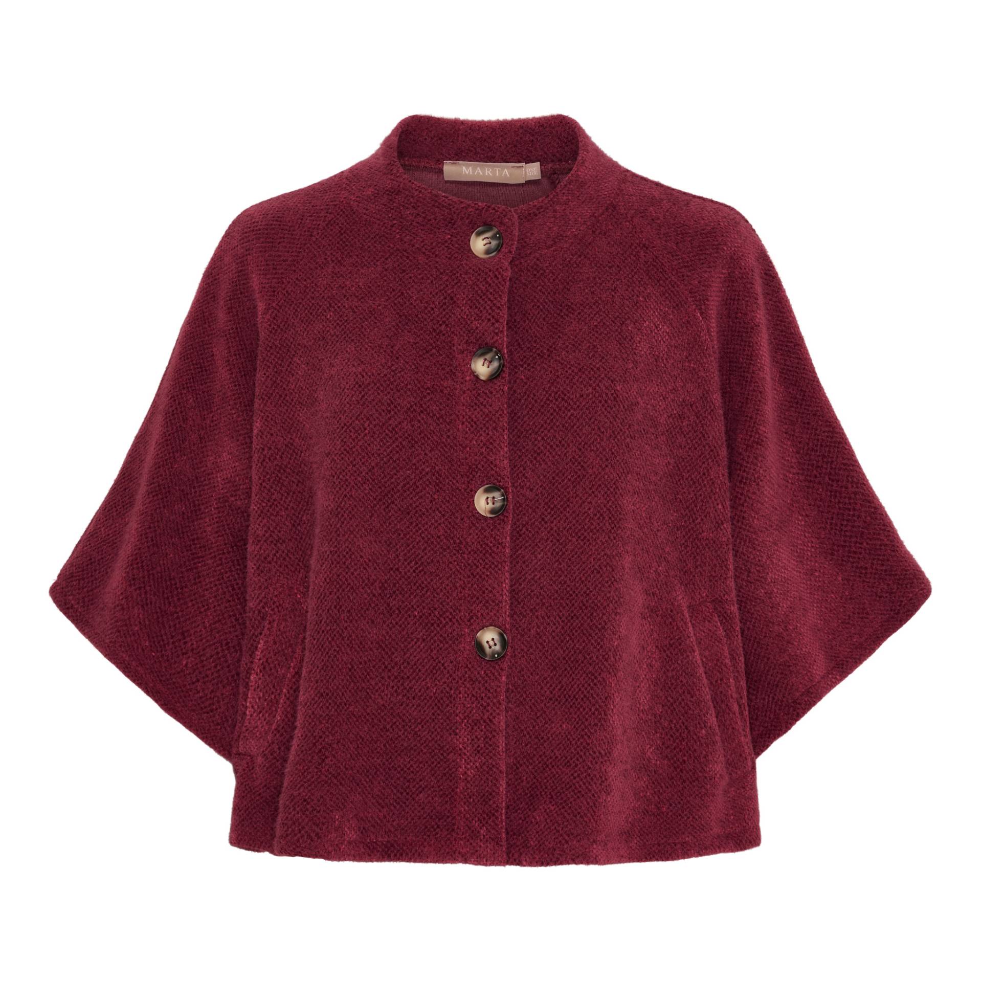 Smuk vinrød jakke fra Marta med brune knapper. Er gennemknappet og har 3/4 ærmer. Materiale: 82% polyester og 18% nylon. Vask: 30 grader.