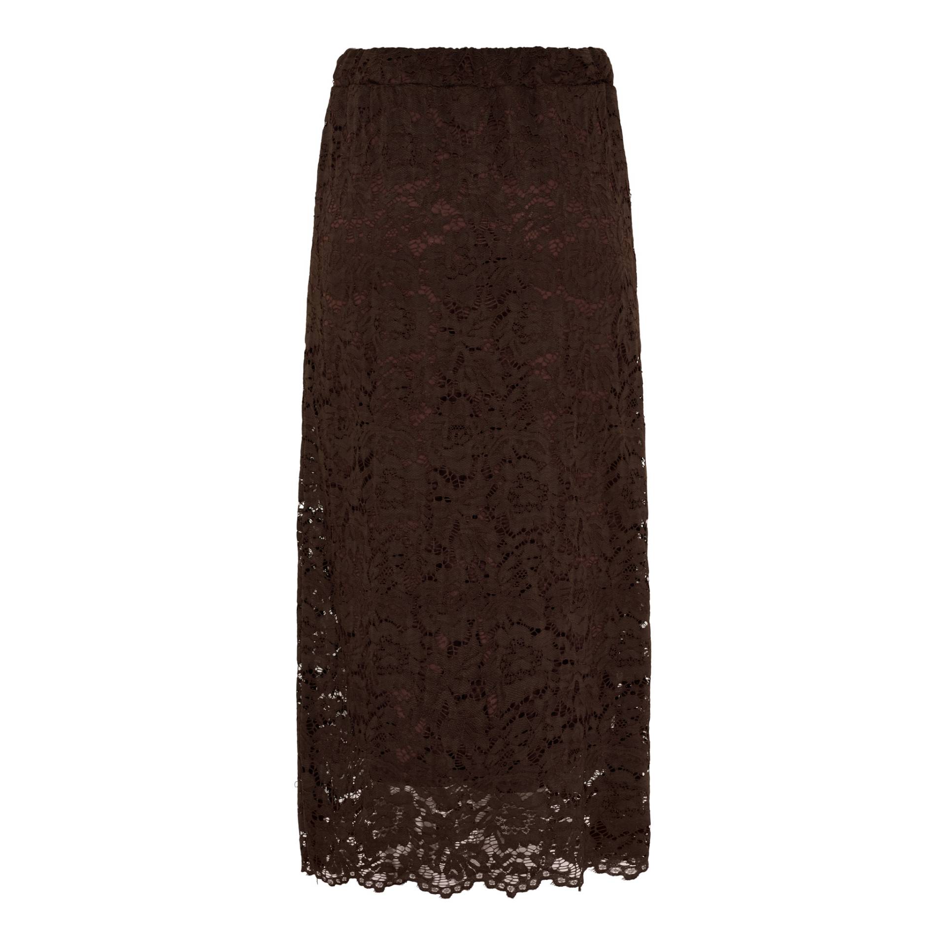 Smuk brun blondenederdel fra Marta. Nederdelen har elastikkant ved taljen og undernederdel. Materiale: 97% polyester og 3% elastan. Vask: 30 grader.