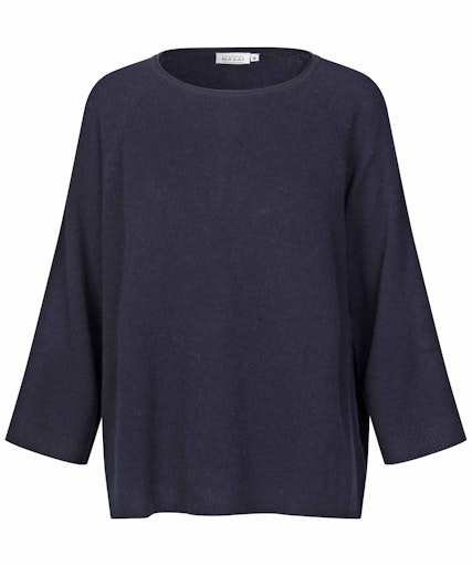 Lækker navy strik fra Masai. Har rund hals og 3/4 ærmer. Materiale: 100% uld. Vask: håndvask.