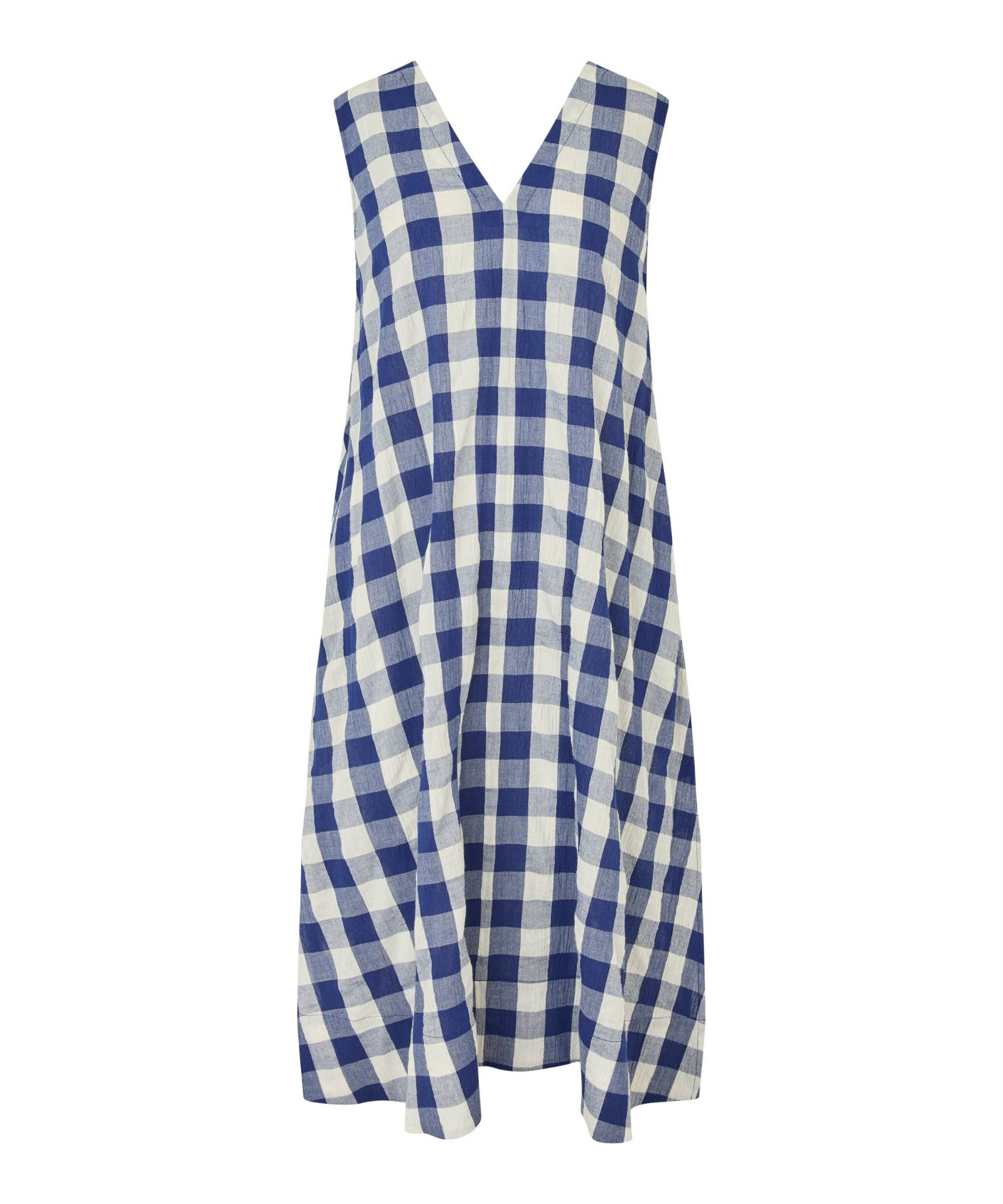 Sommerkjole i let bomuld med tidløse tern. Tern går aldrig af mode og denne kjole er et bevis på hvorfor. Den er skabt i let og luftigt bomuld med klassiske Gingham-tern, der får kjolen til at bølge smukt om kroppen. Det ærmeløse design har et flatterende V-snit foran og en firkantet udskæring bagpå med smock, der sikrer en behagelig og velsiddende pasform. Diskrete stiklommer og høje slidser i siderne fuldender det afslappede, feminine udtryk. Brug den solo på varme dage eller med en T-shirt under for et moderne lag-på-lag-look. Pasform:A-Shape Model Information:Modellens højde er 177 cm, og bruger størrelse M Materiale:100% bomuld Vask:Skånevask