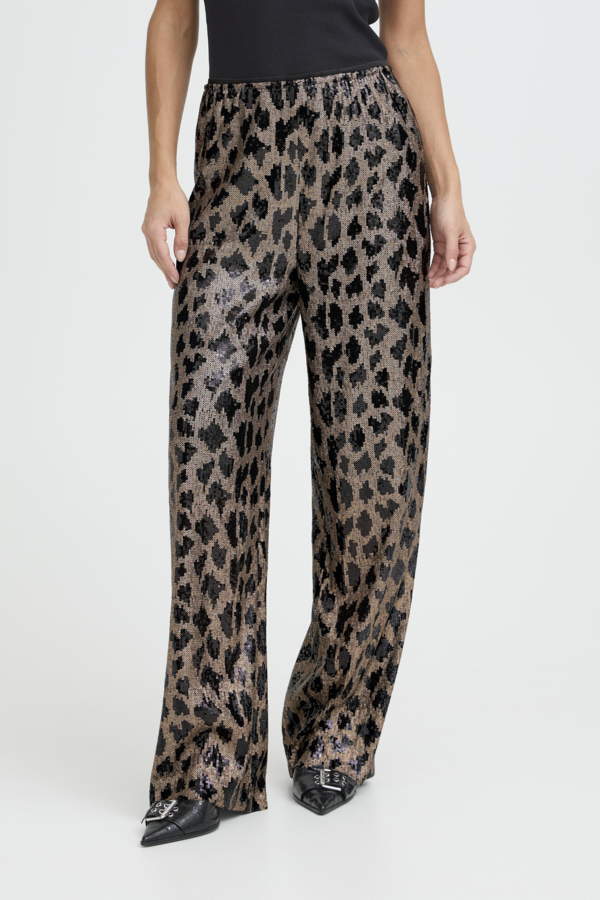 Festilige sandfarvede pallietbukser med sorte prikker. Har fuld længde og lige vidde i benene. Materiale: 65% polyester og 35% viskose. Vask: 30 grader.