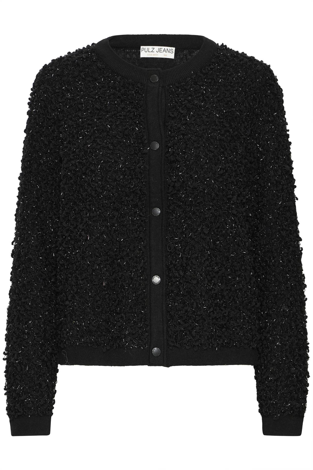 Festlig sort strikcardigan med glitterdetaljer. Er fremstillet i strækbart materiale og er gennemknappet. Materiale: 40% akryl, 40% polyester og 20% polyamid. Vask: 30 grader.