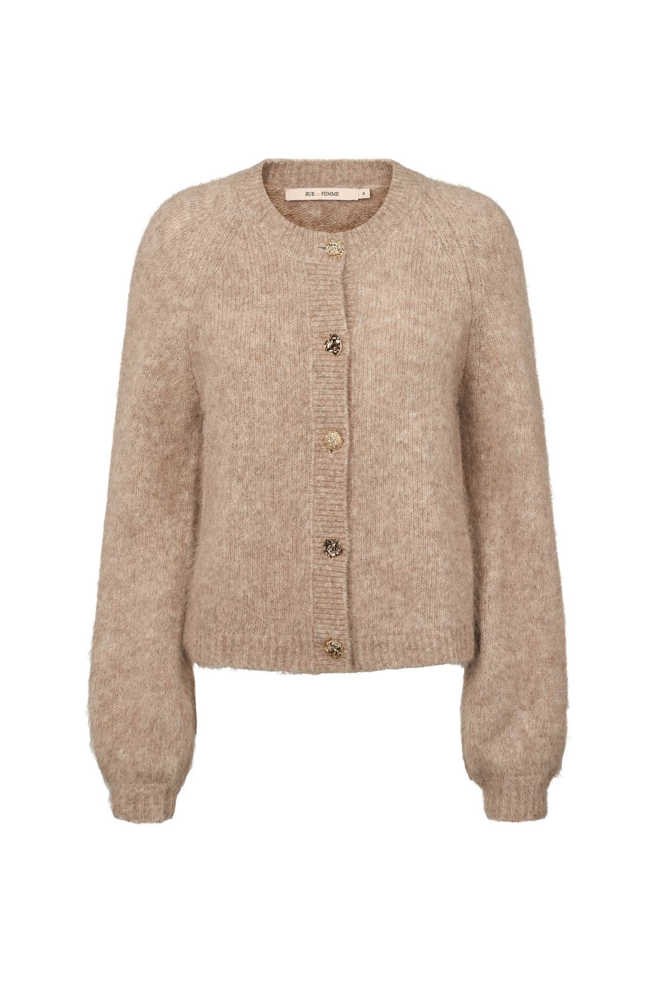 Lækker sandfarvet cardigan fra Rue de Femme med guldknapper, der giver den et twist. Materiale: 59% alpaka, 25% akryl, 15% nylon og 1% elastan. Vask: 30 grader.