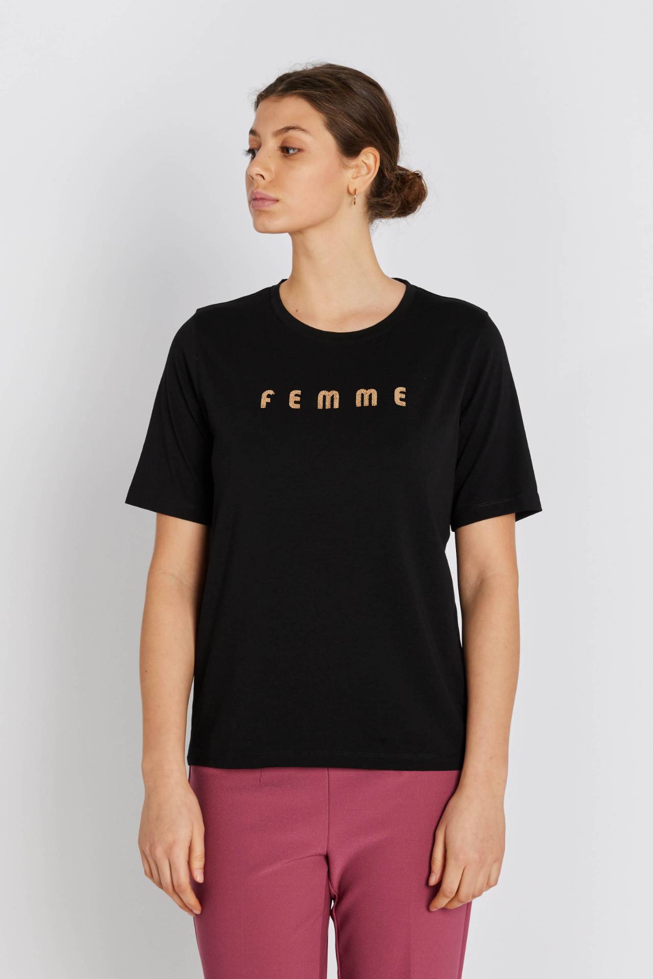 RDFAlvinaSiv T-shirt er en klassisk t-shirt med et rent, moderne udtryk. Det bløde stof suppleres af et dekorativt FEMME-logo foran, hvilket tilføjer subtil karakter. Dens lige silhuet gør det let at integrere i enhver garderobe. En alsidig basis, der passer både til skræddersyede stykker og afslappede denim. - Rund hals - Korte ærmer - FEMME-logo foran - Lige, afslappet pasform - Blødt og fleksibelt stof Kvalitet: 95% Bomuld (Økologisk) 5% Elastan