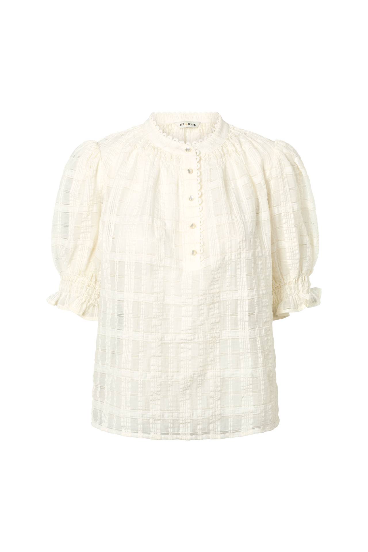 Rowan-skjorten er en feminin skjorte med korte pufærmer og delikate detaljer. Den teksturerede overflade og den lille ståkrave skaber et let, elegant look med et strejf af vintagecharme. Style med bukser med høj talje for et tidløst look, eller med et nederdel for en mere romantisk følelse. - Lille ståkrave med knaplukning foran - Korte pufærmer med elastiske manchetter - Dekorative rynker ved skuldrene - Let tekstureret overflade Pasform: Regular Kvalitet: 85% Viscose 15% Polyamide