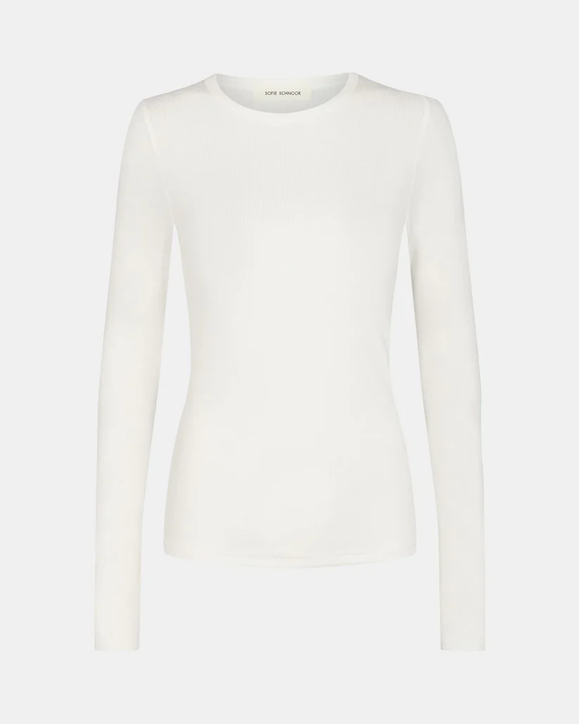Super dejlig langærmede trøje fra Sofie Schnoor i creme. Den har rund hals med lange ærmer, og går til hofterne. Brug den indenunder strik, cardigan osv. Pasformen er normal. Kvalitet: 90% viskose, 10% spandex Vask: 30 g.